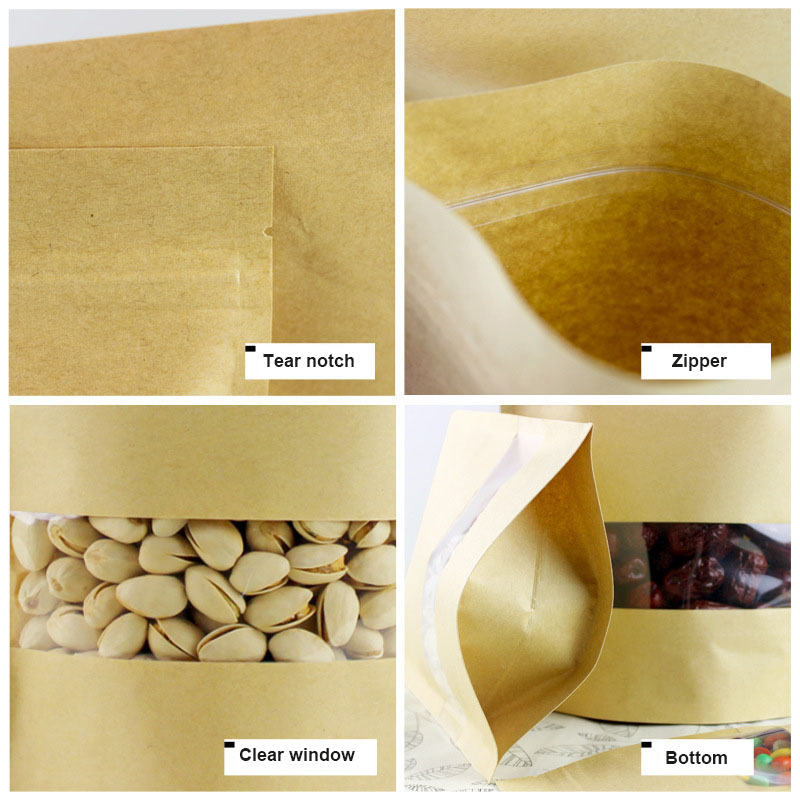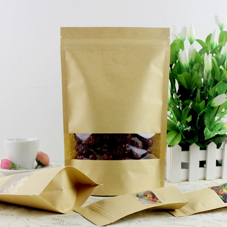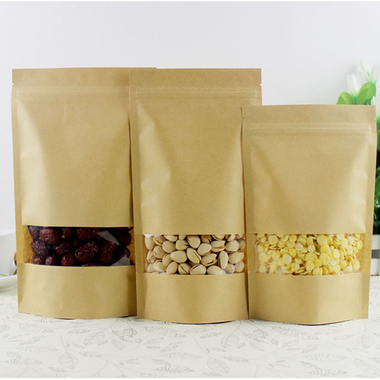 | Brown stand up pouch with clear window Thickness:140micron Material:kraft paper/pet/cpp | 9*14+3cm | 0.013 |
