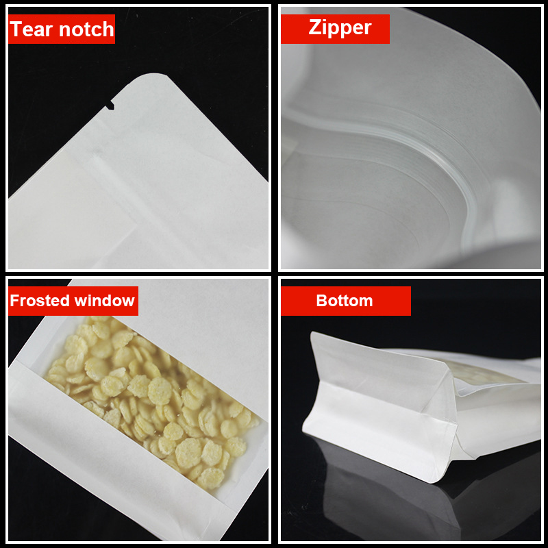 | White flat bottom with frosted window Thickness:150micron Material:MBOPP/White Kraft Paper/CPP | 10*20+6cm | 0.063 |